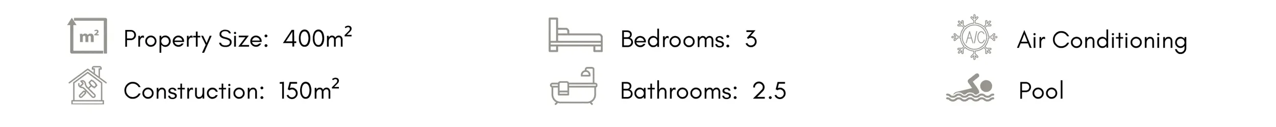 The home is constructed with durable block walls and organized around an open-concept living and dining area. Large doors open directly to a covered outdoor terrace with a barbecue area, a wet bar, and ample seating. The space is designed for easy entertaining and comfortable daily living. A 3 × 7 meter swimming pool sits within the fully fenced garden, providing a low-maintenance centerpiece for the property.